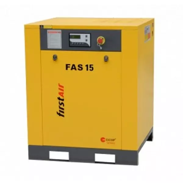 Compressor de parafuso rotativo de alta eficiência Refrigerado a ar Design de fácil manutenção Acionamento por correia em V Pressão operacional 8 a 10 bar(g) Vazão 1,98 m3/min – 2,11 m3/min Potência nominal do motor 15 kW Com motores de acionamento classificados na classe de eficiência energética IE3, nível de proteção IP 55, classe de isolamento tipo F Também disponível com reservatório de ar de 200 litros + secador (FAS 15-AT)