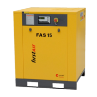 Compressor de parafuso rotativo de alta eficiência Refrigerado a ar Design de fácil manutenção Acionamento por correia em V Pressão operacional 8 a 10 bar(g) Vazão 1,98 m3/min – 2,11 m3/min Potência nominal do motor 15 kW Com motores de acionamento classificados na classe de eficiência energética IE3, nível de proteção IP 55, classe de isolamento tipo F Também disponível com reservatório de ar de 200 litros + secador (FAS 15-AT)
